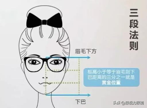 在分析人的脸型时,有一个三段法则:从眉毛下方到下巴这个距离,分为三等份。在挑选眼镜时,建议镜框的高度应小于等于眉毛下方到下巴距离的三分之一。