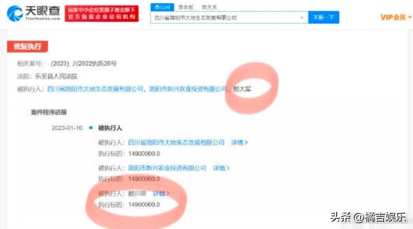 企查查APP显示,1月18日,四川省简阳市大地生态发展有限公司,周震南父母被恢复执行5850万, 被执行原因曝光。关联案件为与遂宁银行股份有限公司成都简阳支行相关金融借款合同纠纷。看了一下视频恍然大悟,过年之前的循例问候,继续还钱,没有还账,利滚利压力大。